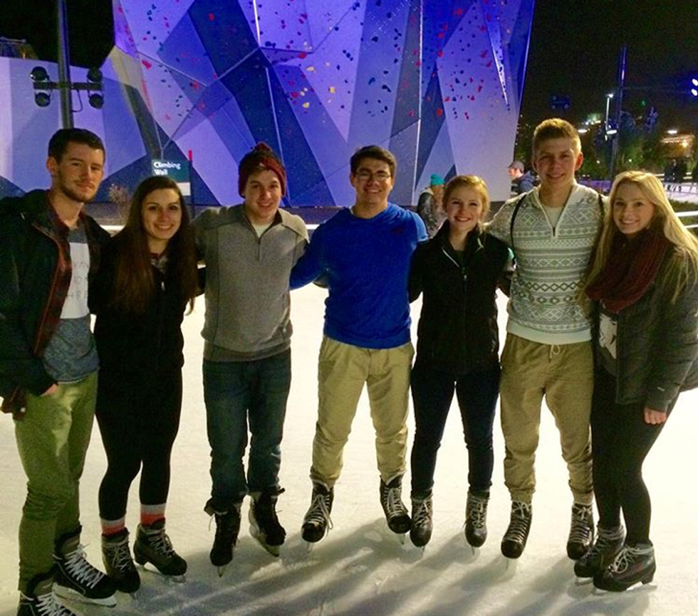 Following a few restless moments, the light blinked to white and we hurried off to the winding ice skating rink. This would be my first ever ice skating experience, yet I had roller skated multiple times, so I laced up the skates and prepared to take a whirl. Except it didn’t quite go like that...I was horribly slow and every slide of the skates killed my shins and made me feel as if I was going to fall. I decided that I hated ice skating, so instead I stuck to the side lines watching my friends have a blast on the ice. Two of them, one blonde and one dark haired, whizzed around the ribbon of ice as if they were born to do it. I watched with envy as they raced past me again and again, until the rest of us convinced them it was time to get some food. But, as you probably know, before you can leave any good gathering of fun, you must take a picture. While the boys gracefully slid into place, I tottered my way over to the line of wanna-be skaters and landed myself in the middle, right next to the dark haired boy.