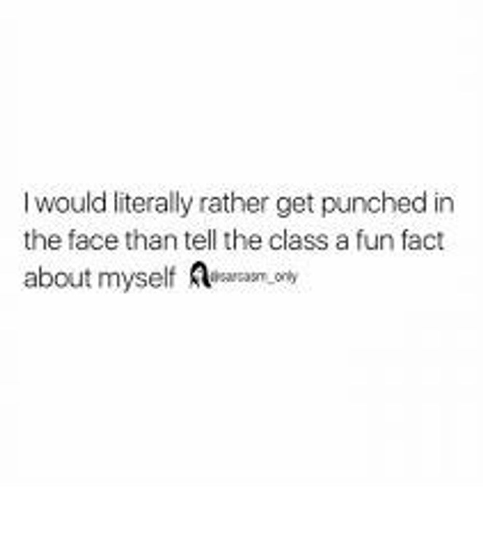 9. Professor: "Everyone go around the room and introduce yourself and then give a fun fact about yourself!" Students: *groan*