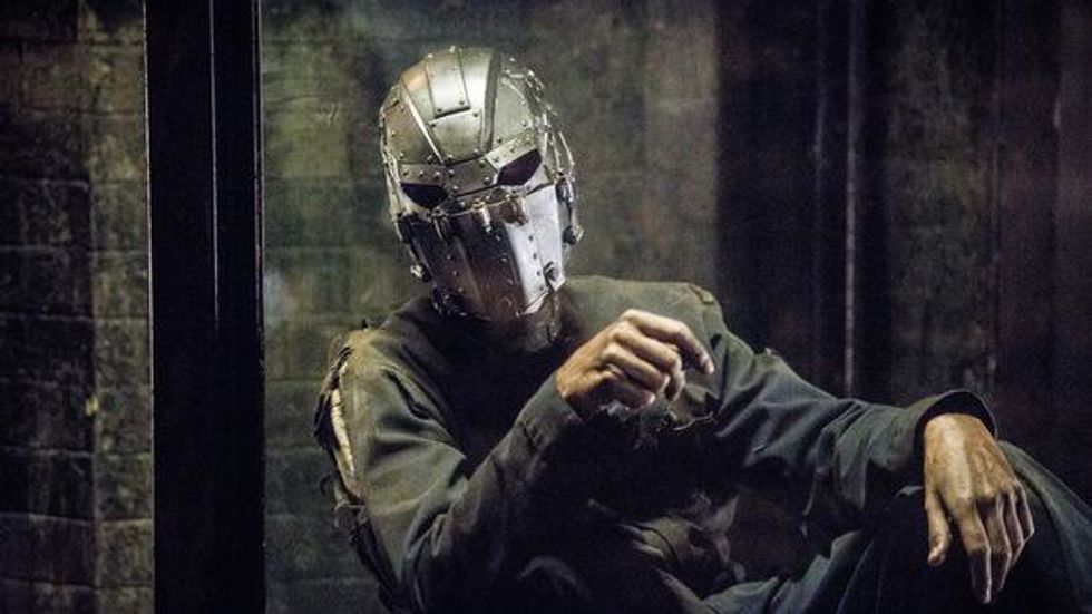 I've seen him christened "The Man in the Iron Mask" by many people, as we have yet to find out his identity. He is masked the entire episode. While it seems that he can see out of the mask and can hear, he's unable to speak. He's in a glass cage, similar to Barry's. As he's unable to speak, he communicates by tapping on the glass. However, we find that he isn't using Morse code, but, according to Barry, he's using a tap code utilized by POWs. It took some time for Barry to realize this, but they're able to decipher one word that our masked man taps out. He taps the letters J-A-Y.