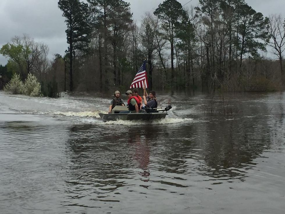 This picture, taken by Wendy Reed Carpenter, shows Keary Martin, Daniel Barnett, Brandon Barnett, and Gabe Johnson rescuing a flag from flood waters on Highway 126 in Winn Parish. A marine mom named Carol Gracie from Jackson Parish thanked the young men saying, "Our sons and daughters and their families make many sacrifices to defend our beautiful flag and many times these sacrifices are unappreciated...This speaks volumes for these young men that they would take the time to save our flag from being destroyed in this flood."