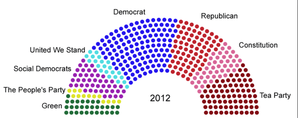 This image shows 8 parties being represented in pretty large numbers. This is a disheartening figure considering that for our presidential election a candidate must be polling at 15 percent in order to debate. In turn, the 15 percent polling number would mean a max of six candidates with the ability to debate. Six candidates, with no sort of majority, is far from the eight parties proportionally present in the U.S. in 2012.