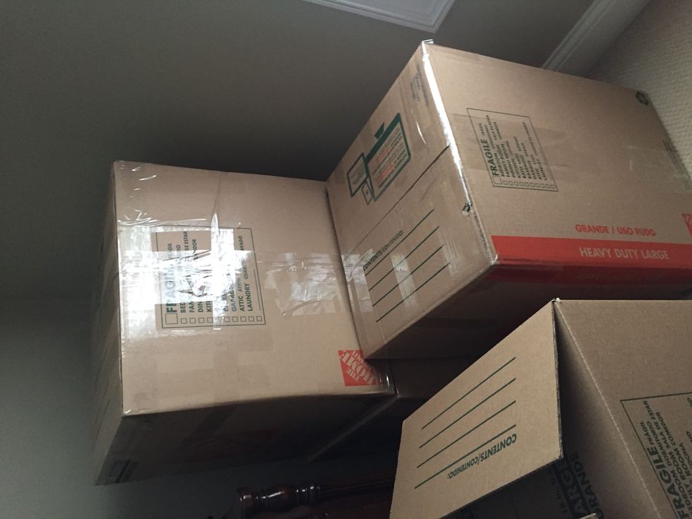 Now as you can see we had to double tape the boxes. Get this getting shipping boxes at Home Depot most likely will have dust on them, that dust makes it hard for the tape to stick. My mother, being the nervous wreck she has been, decided to wrap the whole box in shipping tape. Going to take me a good 10 minutes just to get the box open on move in day.