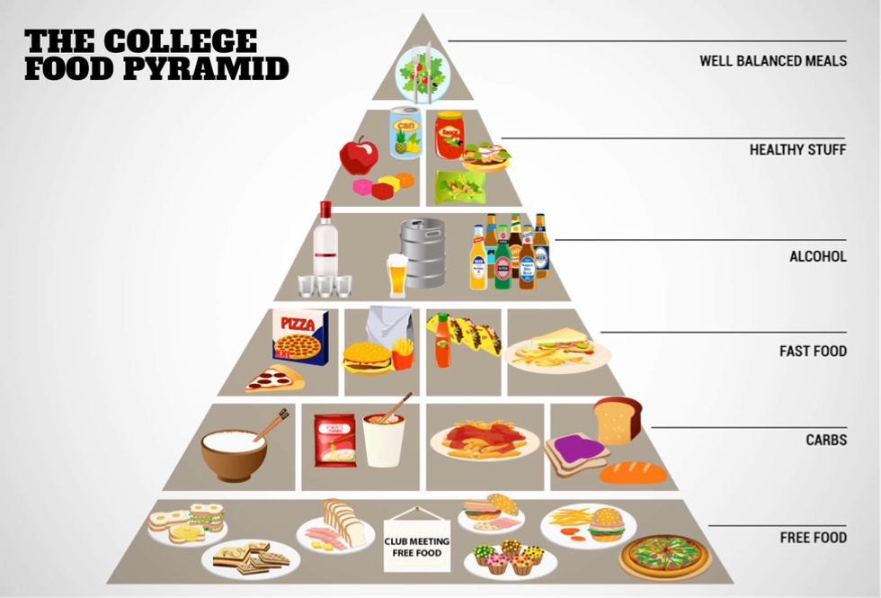 Most of us were provided groceries and meals when we lived at home, so for the first time, we are completely free to make our own food decisions. This means eating wherever, whatever and whenever we please. Although this is great, it can be a huge factor regarding weight gain. When we are sick of our meal plans we go out to eat, where we typically don’t buy healthy options.