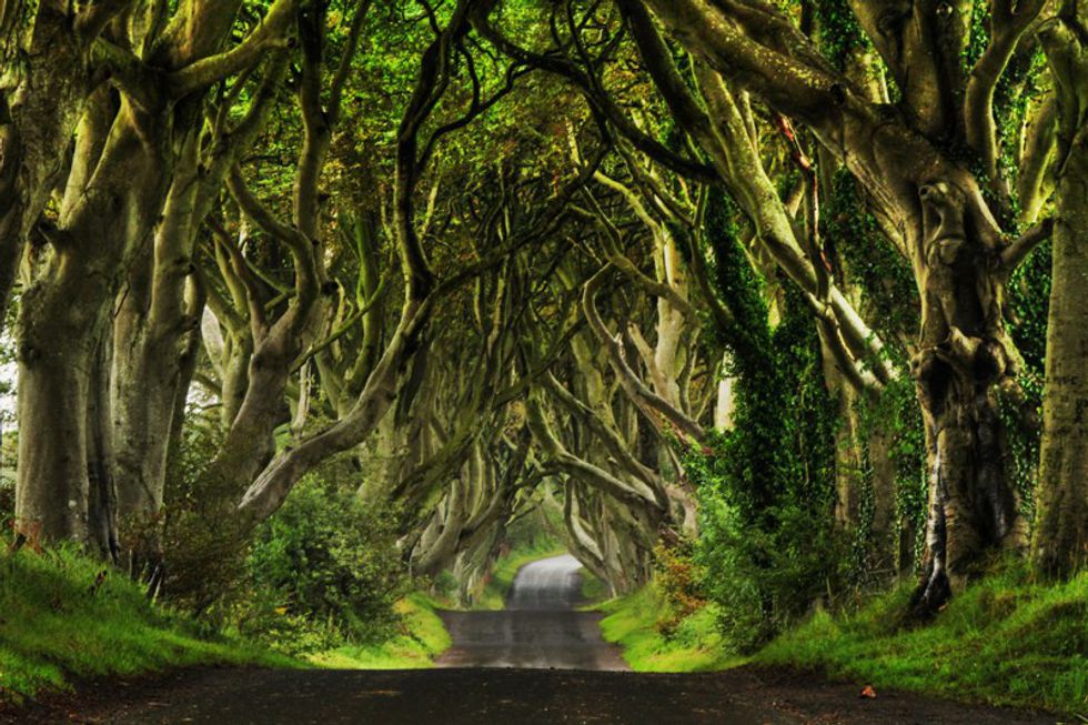 The Dark Hedges is located in County Antrim in Northern Ireland. The hedges were originally planted as an entryway for the Stuart family in the 18th century to impress guests riding up to their castle. In "Game of Thrones," the dark hedges is the setting of King's Road, or the largest road in the Seven Kingdoms. King's road connects King's Landing in the south all the way to Castle Black in the north.