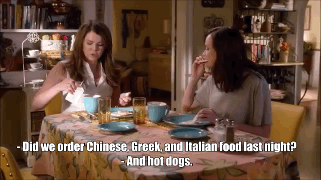If Lorelai and Rory do one thing right, it's eating. For being so tiny, they sure can eat. Whether it be pizza and five pounds of candy for a movie night or burgers and three plates of cheese fries at Lukes, the duo sure knows how to eat well.