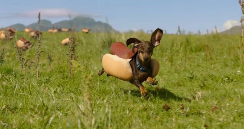 A herd of running Dachshunds dressed up as hot dogs! This situation should be automatically cute, right?