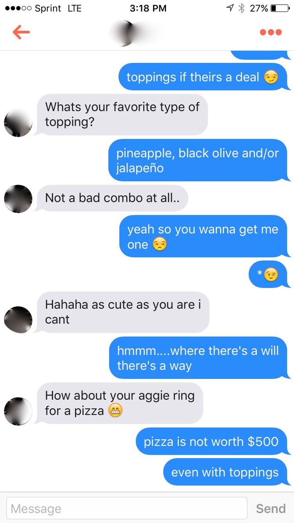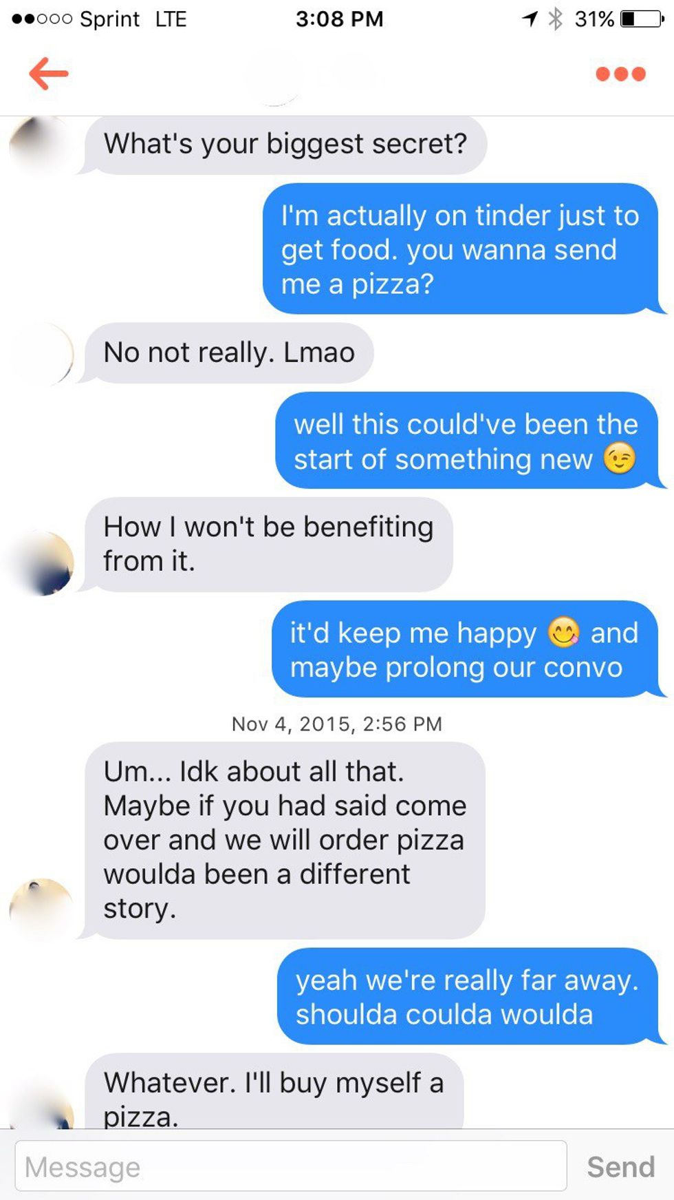 So, this experiment was a lot harder than expected. First, I had to be kind of a butt and be pretty direct about my intentions with my matches. This consisted of answering the typical “Hey, what’s up?” question and then inserting something along the lines of, How do you feel about sending me a pizza?
