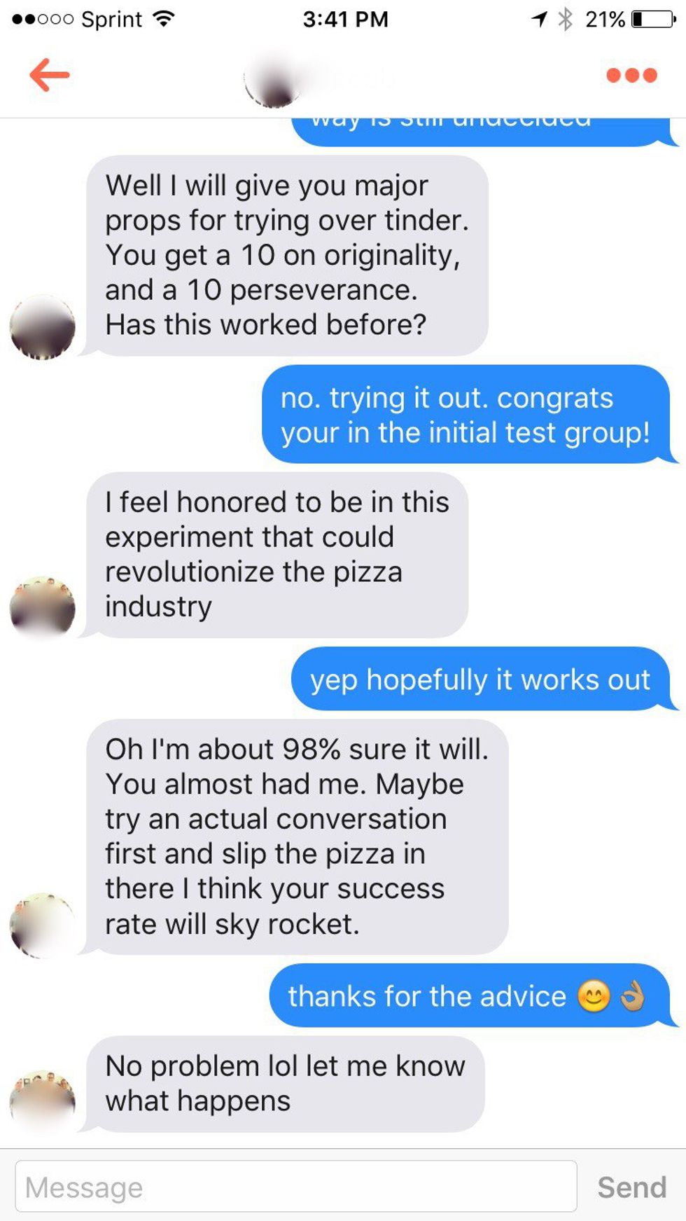 - Wait for match to start convo and conveniently sneak in your want for free pizza.