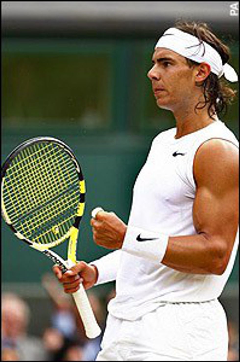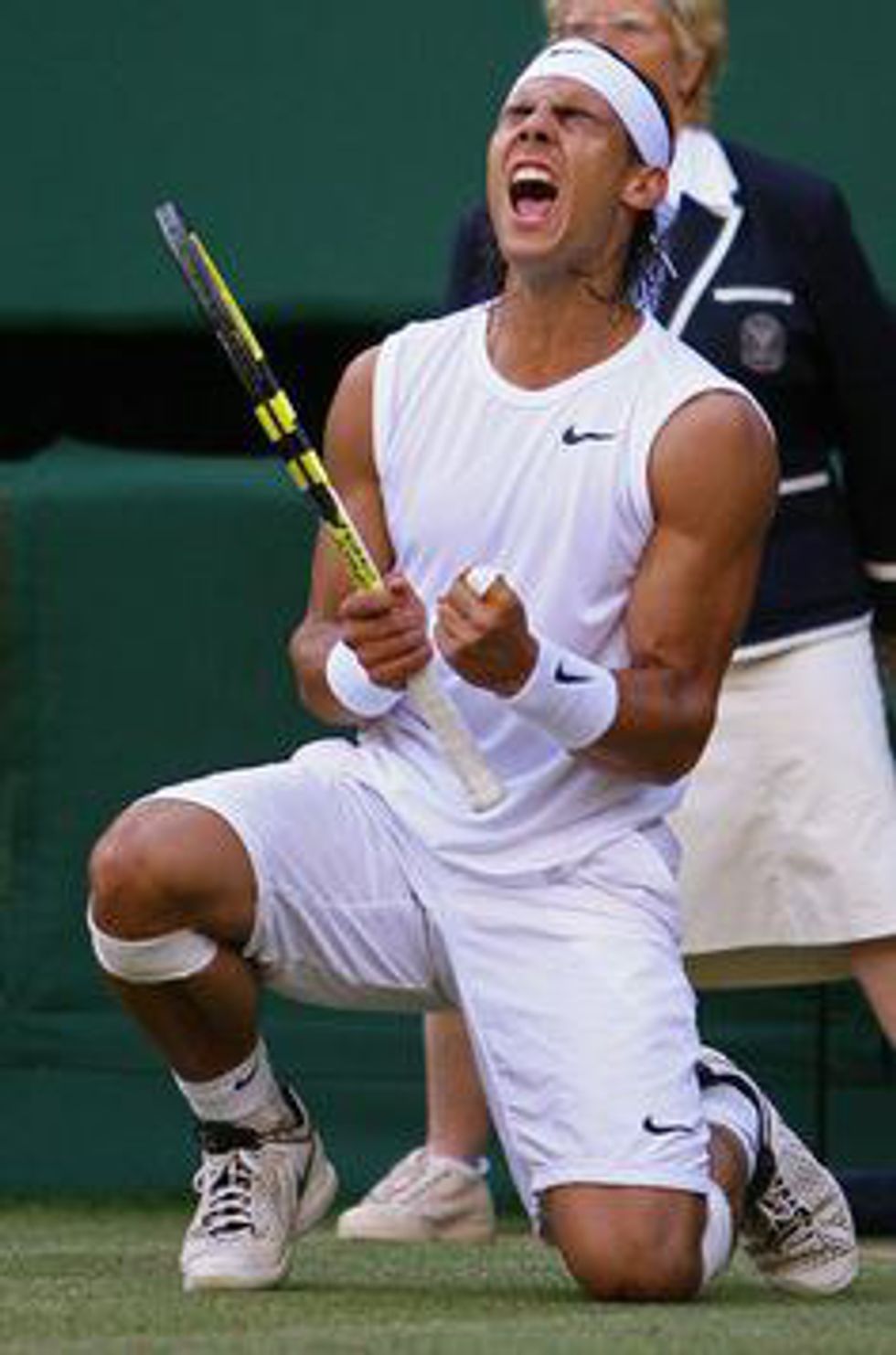 A long rally, and Federer hit a forehand approach shot down the line; Nadal scrambled and smacked a forehand passing winner. Nadal yelled in triumph. 7-8, and this time, Nadal had the championship on his racket.