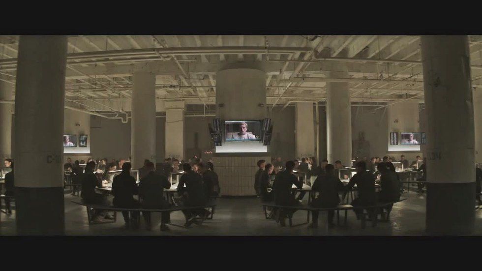 A few minutes ago the casting people described to us the scene we would be filming today: Katniss is sitting in the District 13 cafeteria when a surprise message from Peeta comes in on a T.V. screen, to which we respond angrily and begin yelling at him. Sounds like fun to me.