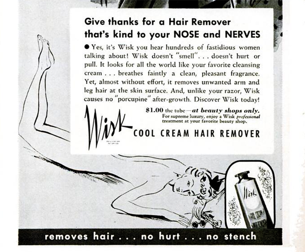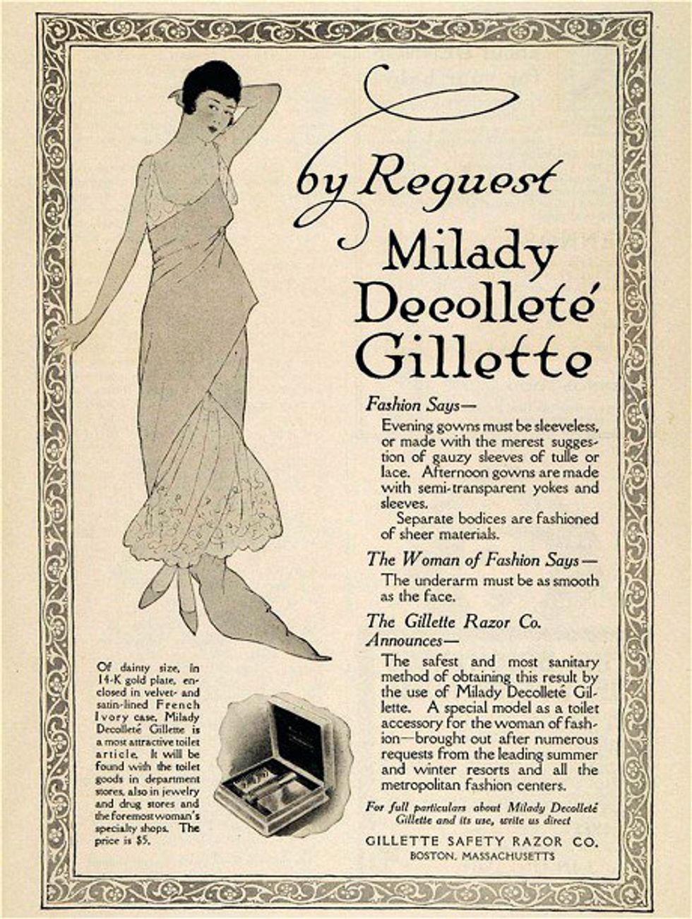 In May of 1915, women had been introduced to dresses that exposed their armpits; this created an opportunity for marketers to introduce a new problem for women and thus a new product for women. In light of this, Gilette introduced their first razor for women, specifically advertised against having armpit hair. Its advertisement stating, “fashion says,” immediately insinuating that not having armpit hair was the fashionable and feminine thing to do. Women subscribed to this “fashion trend” quickly, truly believing that removing their armpit hair was a natural and womanly thing to do.