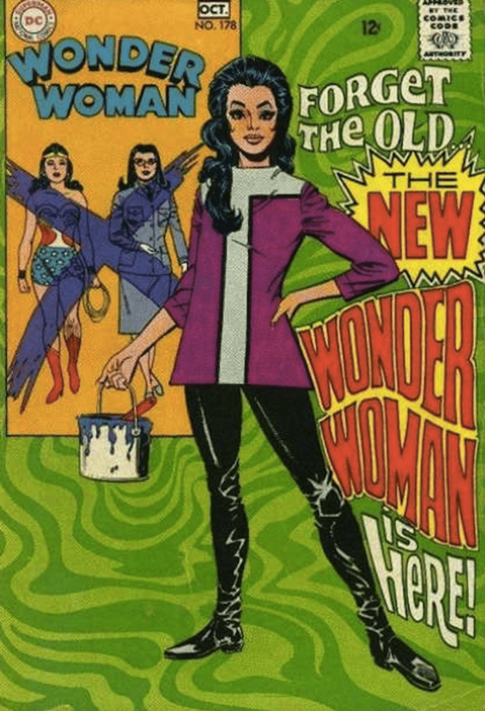 The "New" Wonder Woman featured a Diana that had given up her powers for a more peaceful, domestic life. She traded in the jumpsuit for black leggings and color-blocked blouse, but still kept the boots. Thankfully, this costume did not last long and in 1972 she returned to her iconic red and blue.