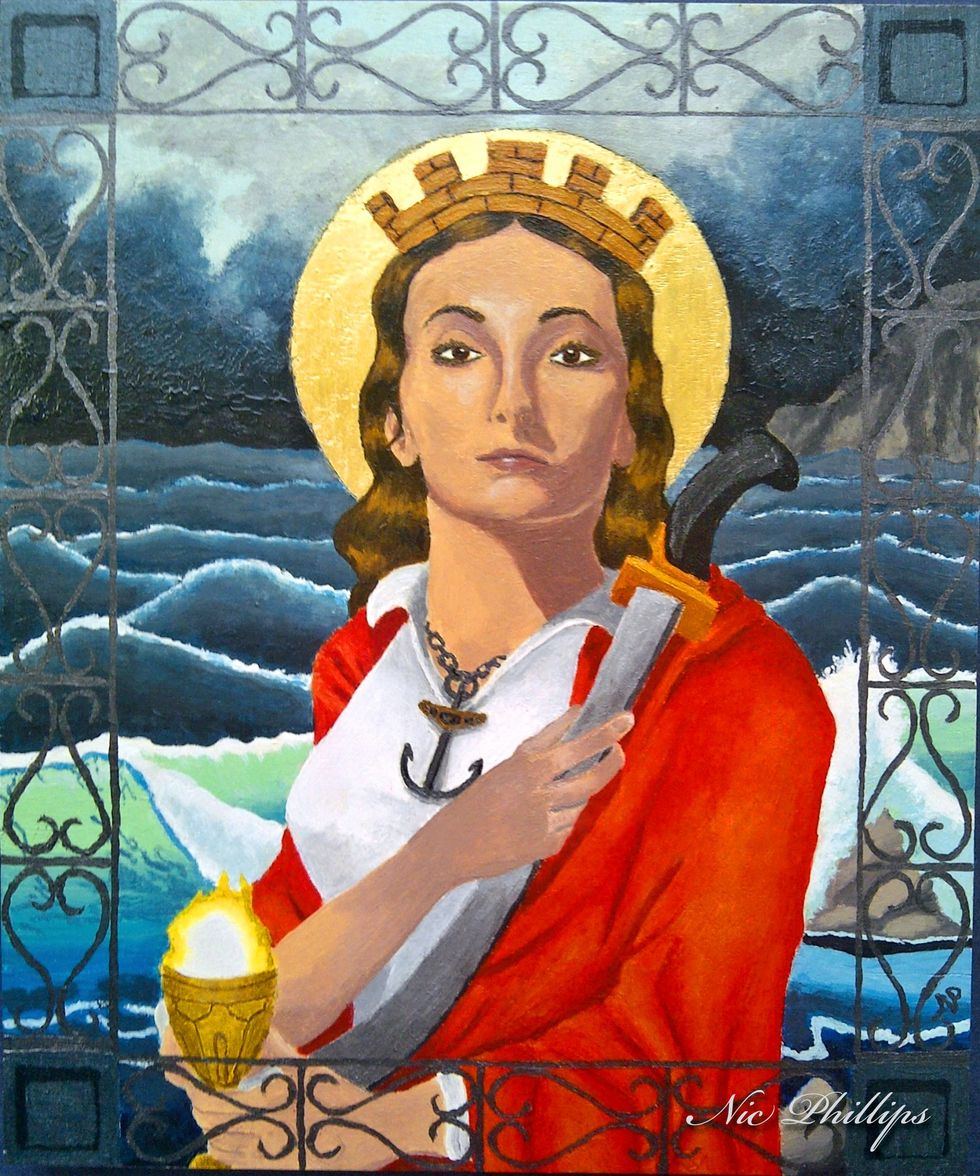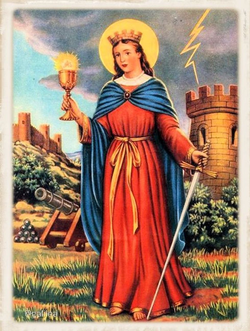 Barbara was declared a saint in 1568 by Pope Pius V and baptized as one of the Fourteen Holy Helpers. Her remains are buried at St. Vladimir's Cathedral in Kiev. Other parts of her body are kept in various Catholic churches around the world as relics.She is the patron saint of armorers, artillerymen, architects, mathematicians, miners and the Italian Navy. St. Barbara's intercession is requested against lighting and fighting canons. The United States Army Artillery Association bear the emblem of the Order of Saint Barbara as a coat of arms. St. Barbara is venerated against diseases as well.