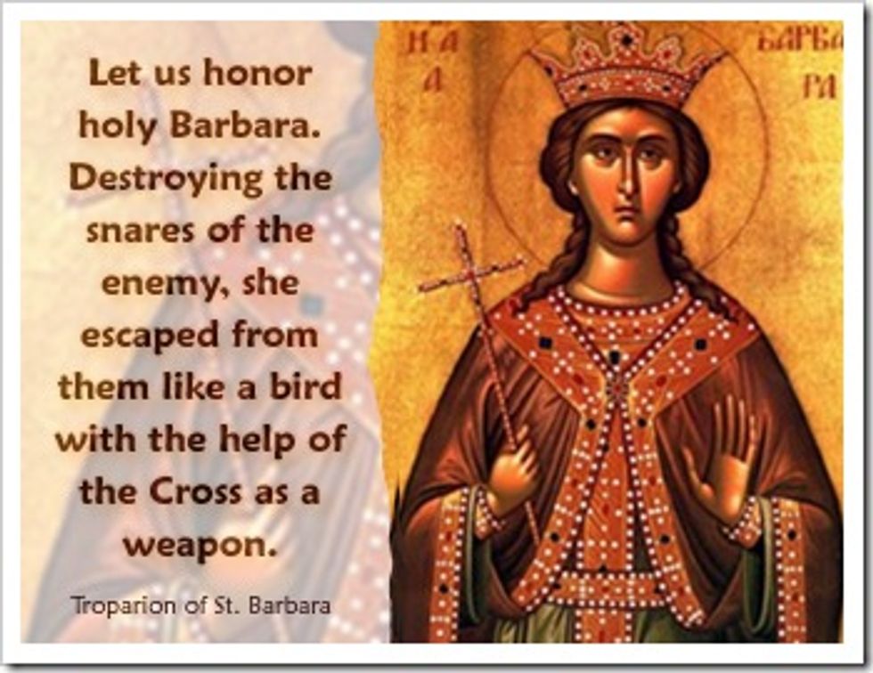 I would like to introduce Saint Barbara whose Feast Day is celebrated on December 4th by the Catholic church. St. Barbara lived a secluded life in which she learned about Christianity, and found inner peace through the love of Jesus Christ.