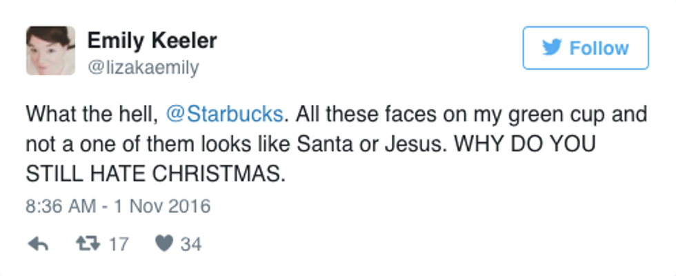 But let's give her the benefit of the doubt. She tweeted this at 8:30 A.M., before she could have her Quad Grande, Non Fat, Extra Hot Caramel Macchiato Upside Down (yes, your barista can apparently make your coffee upside down). Like I said, huntys, they never mentioned they were holiday cups. They typically release their "Red Holiday Cups" every year, and since these are not their "Green Holiday Cups," they will probably be releasing another one and-