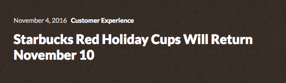 There we go! It's going to be okay. You with the fire in your sleep-deprived eyes, Starbucks heard you loud and clear. Next week they will have your red cups for your Grande Chai Tea Latte, 3 Pump, Skim Milk, Lite Water, No Foam, Extra Hot, and life will be just dandy! So while your peers around drink out of the cups spewing the evil liberal agenda, you can be content knowing that in just a few days you will be drinking out of the good and holy red cups, content that you helped end the war on Christmas before it even began.