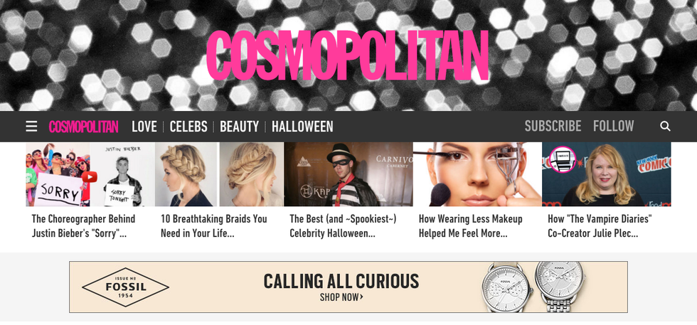 I was pleasantly surprised to find a few articles related to feminism, women in power and other political topics. However, in the effort to actually find those articles I felt as if I was digging a hole through my laptop. The top listed article subjects on Cosmo's website were all related to beauty products and bettering your lifestyle. Also, the top scrolling thumbnails for articles had to do with Justin Bieber's newest music video, celebrity Halloween costumes and different hair braid styles you must try, like, right now. Big. Whoop.