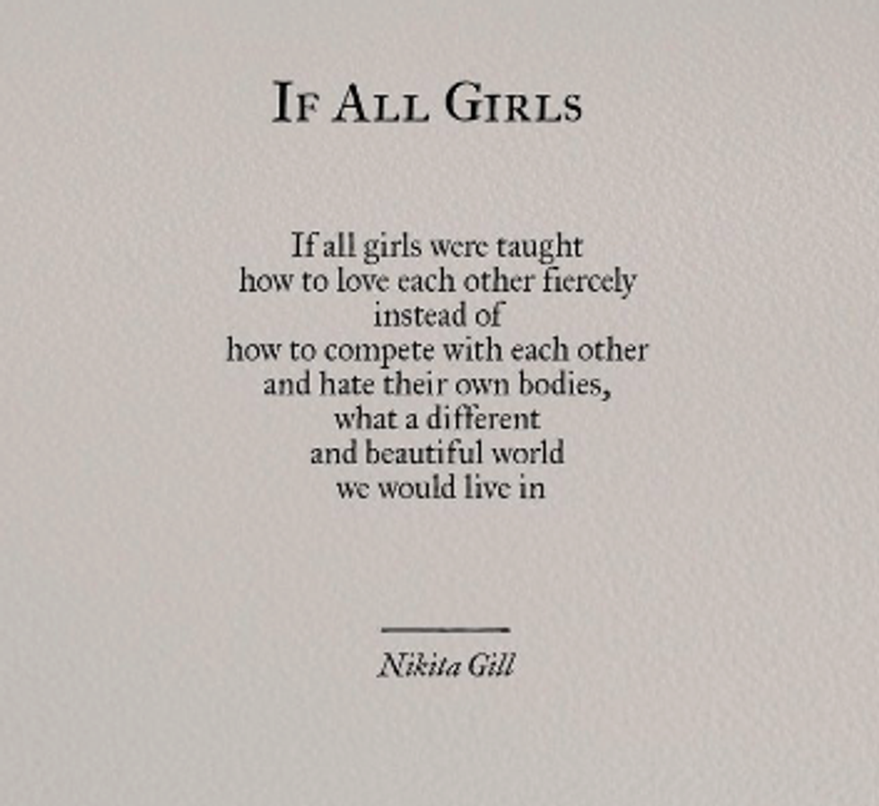 In this society, girls are pitted against each other, raised to believe that we are each other's competition for trivial things such as male attention and beauty and taught that we are all catty and superficial. It breaks my heart when I see girls fall into this society made stereotype. Contrary to popular belief, girls aren't born being caddy, gossipy, superficial and competitive over boys. Girls are caring, supportive and loving.