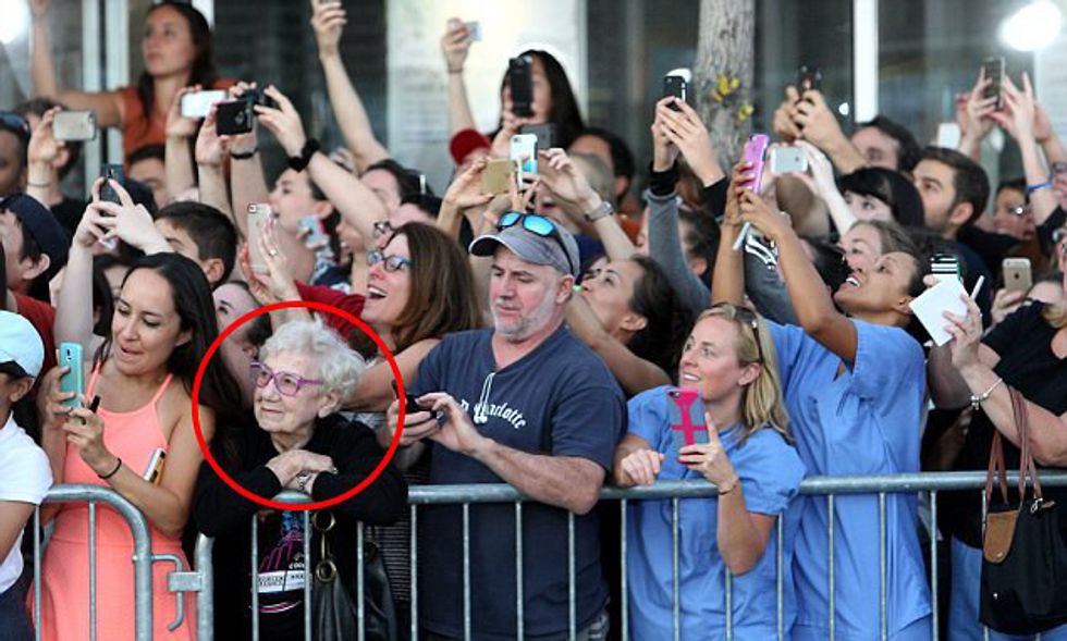 Of all the people behind this gate, there is only one woman not on her phone. You can see everyone around her reaching around each other, standing on tip-toe trying to record what is coming their way. However, this one woman in the front is seeing what is going on with her own eyes, not through her phone screen.