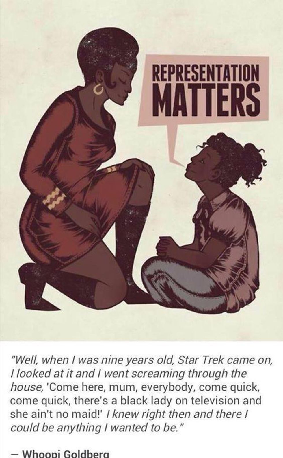 Representation is the acknowledgement that people are not the same. A person's skin color, hair type, sexuality, and/or gender identity does not make them a certain type of person. No one stereotype should be allowed to represent a group of people anymore. It is 2016 and we need to change. We notice where we do not exist. And we are asking for the industries to change, to hear us, and include us.