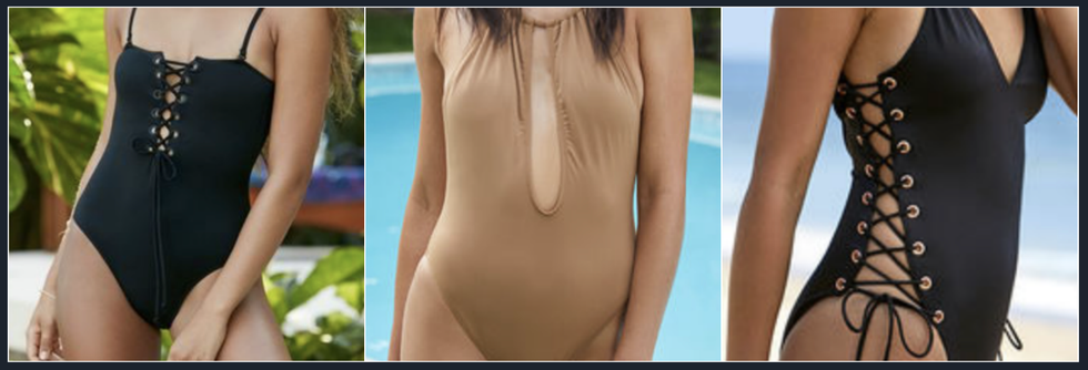 In almost every single bathing suit set in women's stores today, this is what you see for the bottoms. Basically, nothing. Growing up, I was always taught to dress modestly, and I find it more comfortable to dress this way. Could you imagine, being a young woman and having to walk around with 80 percent of your butt hanging out? Finding modest bathing suits has become more and more difficult as their fabric is becoming less and less. Even one piece bathing suits, which are typically used by those of us who desire more coverage, are losing fabric. The one piece bathing suits in the image below are what a majority of one piece suits look like today.
