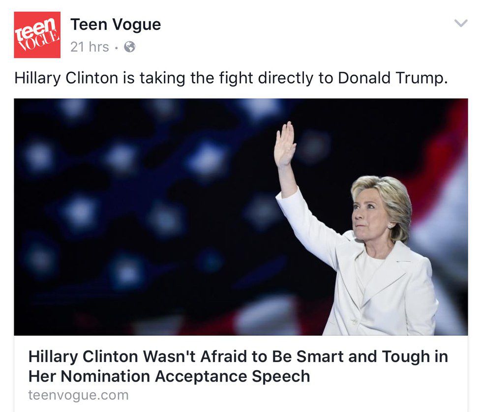 In particular, I'm speaking out against Teen Vogue's social media presence over this election. Especially their Facebook. Why is it that everytime Trump calls out Clinton, they release a ton of negativity onto him but when Clinton says something negative about Trump, it receives a post of nothing but positivity? Double standard much?
