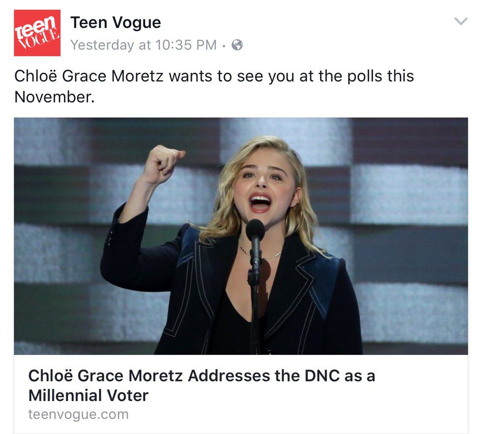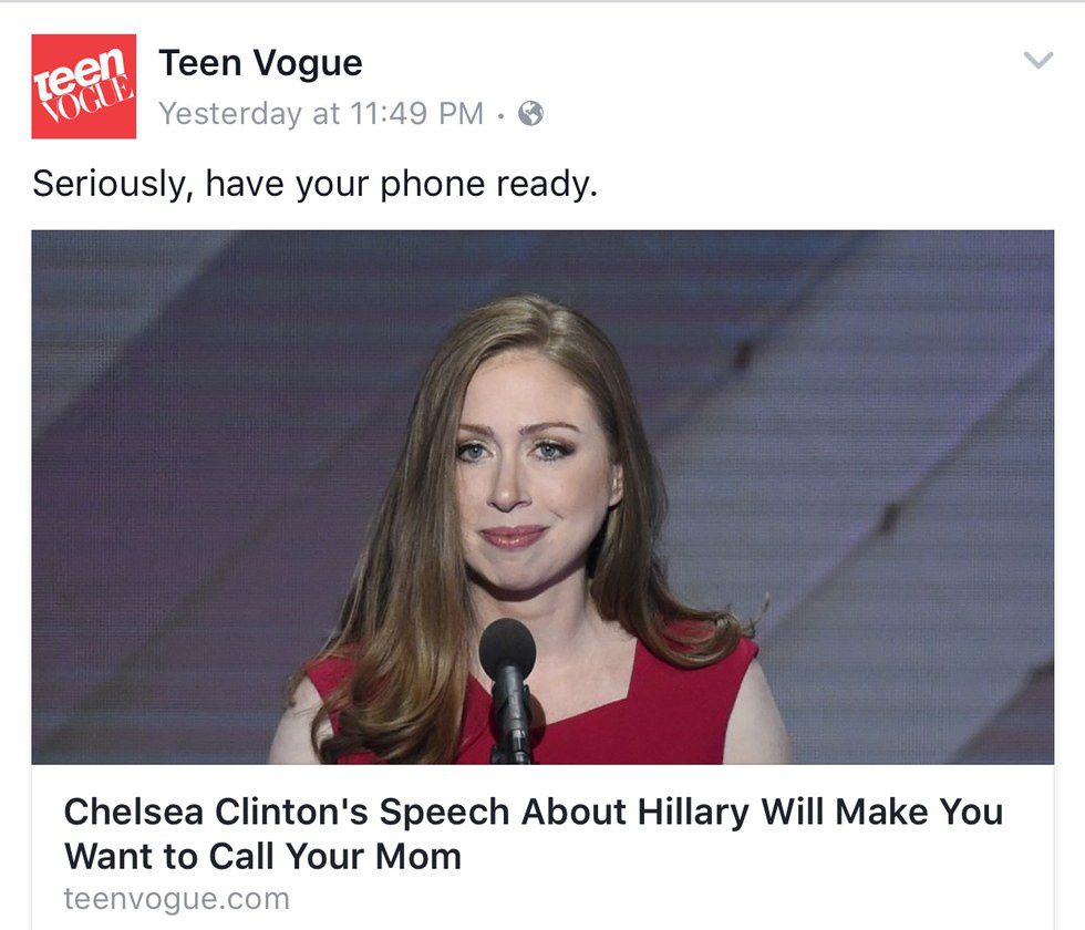 Chelsea's speech on the other hand was thrown into a post about nothing but 'emotions' and 'pride to her mother.' Once again, why Teen Vogue must you have went and done that? Why couldn't Ivanka's or Tiffany's of Donald Jr.'s or Eric's speech made you want to go and phone your father? Right there in itself was partially sexist and patriarchal, something Teen Vogue "swears" they aren't. “I’m here as a proud American, a proud Democrat, a proud mother, and tonight in particular, a very, very proud daughter.” I'm sorry, but did Trump's kids not say the same exact thing about their father? Your mother may be a great mom but she is by no means fit to be the leader of America. She has done too much of a messy job to cover her tracks in ways that could have totally been avoided if she would have just been faithful to America and our people.