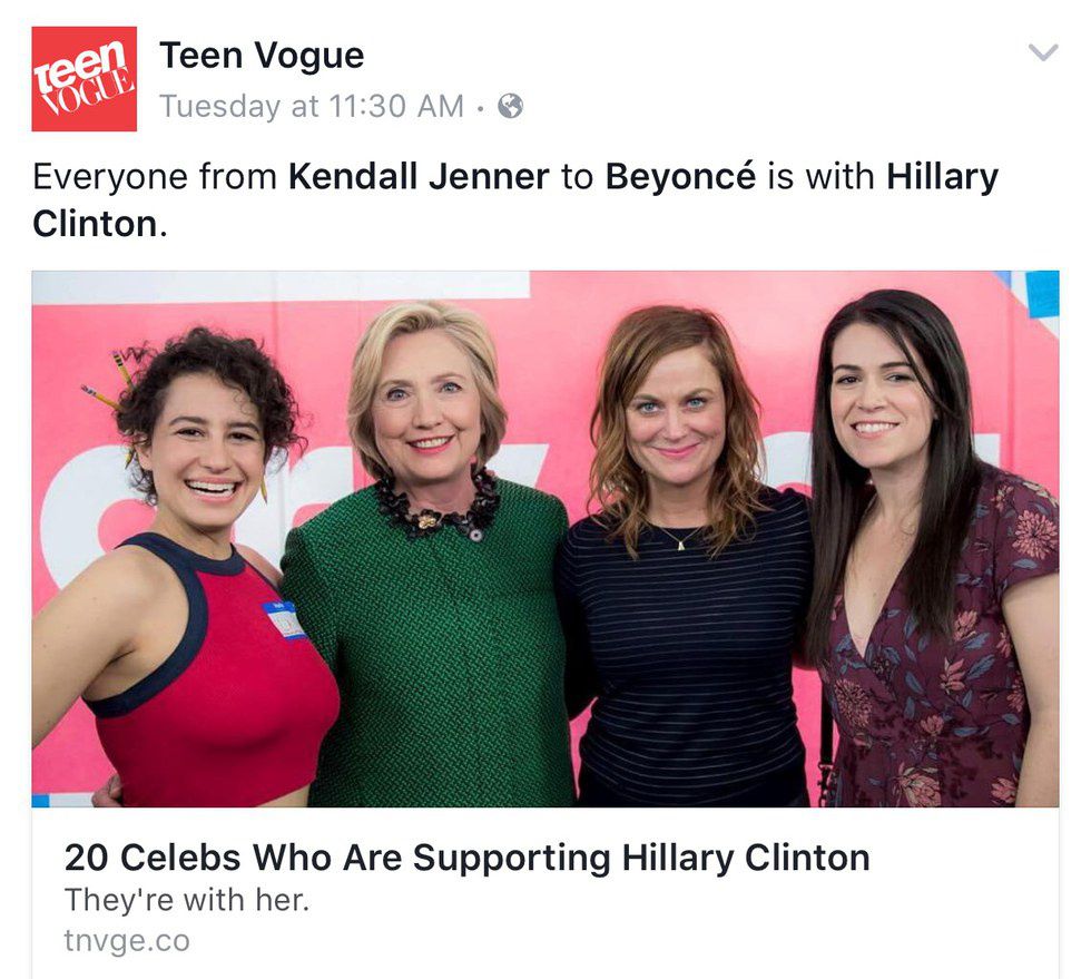 So recently, I've been getting pretty upset over one thing in particular and I know I can't be the only one who feels the same way. In the past months, many celebrities have come out in support of Hillary Clinton, and I feel they do not know exactly what that entails. Websites/magazines such as Teen Vogue and Seventeen have also used their social media platform to make their influential voices heard, as well. While I am all for everyone being entitled to their opinions and what not, I am not particularly for people dragging others of the same negative doings -- maybe even worse -- down into the dirt with the other equality guilty party. Yes, yes, I know, this is exactly what this Presidential election has come to, but I for one know I am not alone in saying that enough is enough. We've had it.