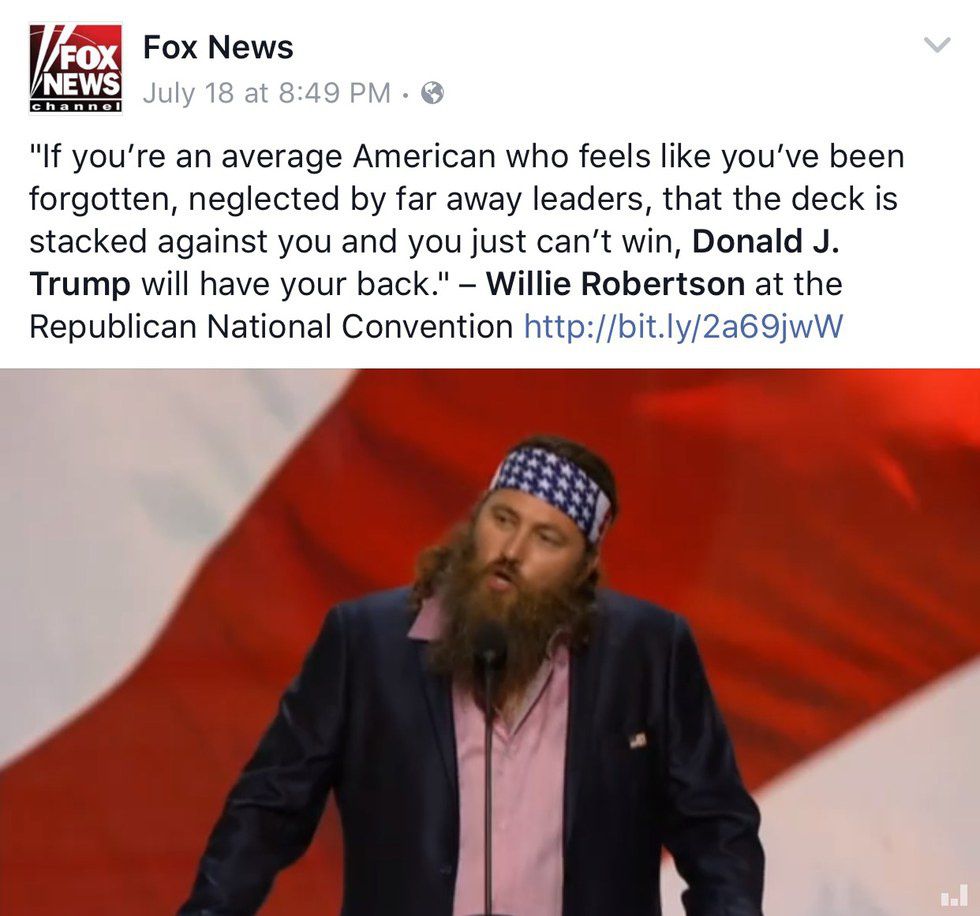 "If you’re an average American who feels like you’ve been forgotten, neglected by far away leaders, that the deck is stacked against you and you just can’t win, Donald J. Trump will have your back." Willie Robertson was one of the many faces that got up on stage at the Republican National Convention in support of Trump. He stressed his thoughts that he believed Trump will highlight and hit if he is elected. Let this be a lesson to many: Trump is for the weaker man. There is a reason that a cop killer's family member was invited to speak at the DNC while an American hero was invited to speak at the RNC. Also, where were the American flags at the DNC? Oh, that's right! Outside the building being burned to the ground.