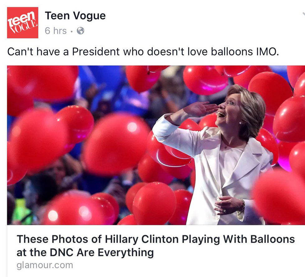 In the mean time, Teen Vogue should take their noses out of the election (even though it is quite enlightening and admirable that they are trying to make a voice for younger people) they are just doing it in an extremely unfair way to the Republican party. Start shedding a voice on that party too and not just the Democratic party. Until they shed light on both parties I myself and many others I'm sure can agree with me on them sticking to articles such as "3 Ways to Make a T-Shirt Cuter" and "What to Do When You're Single and All Your Other Friends Aren't". For example, why is this important? Stick to the "more exciting" side of things. Again I ask, why was this so relevant it deserved it's own article? P.S. I'm sure Donald Trump loves balloons, so if that's why you decide to vote, make it fair and register in your head that not just one candidate loves balloons, but both.