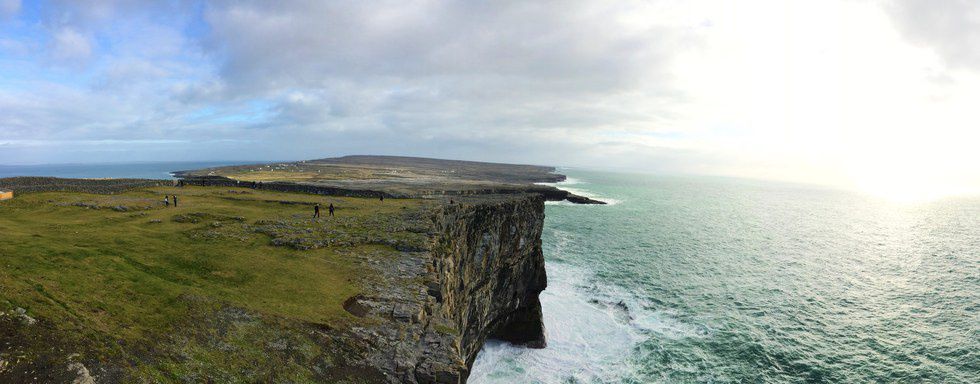 Upon reaching Dun Aonghasa one immediately takes in the large dry stone wall surrounding the Iron Age fort wrapping around almost 900 meters around. One sees the patches of green grass with jagged limestone rocks in between, but what one does not see at first, is the most spectacular view. Continue walking toward the fort, duck to fit through the low lying stone archway that acts as an entrance to the fort’s interior, and continue to walk along to the edge. The edge of what, you ask? The literal edge of the grass, but what feels like the metaphorical edge of the world, a 300 foot vertical drop to the dark blue-grey water below. These sea cliffs seem to have sprung up from nowhere, and would be left completely unnoticed if visitors do not walk to the edge, but once there, it encompasses one’s entire being.