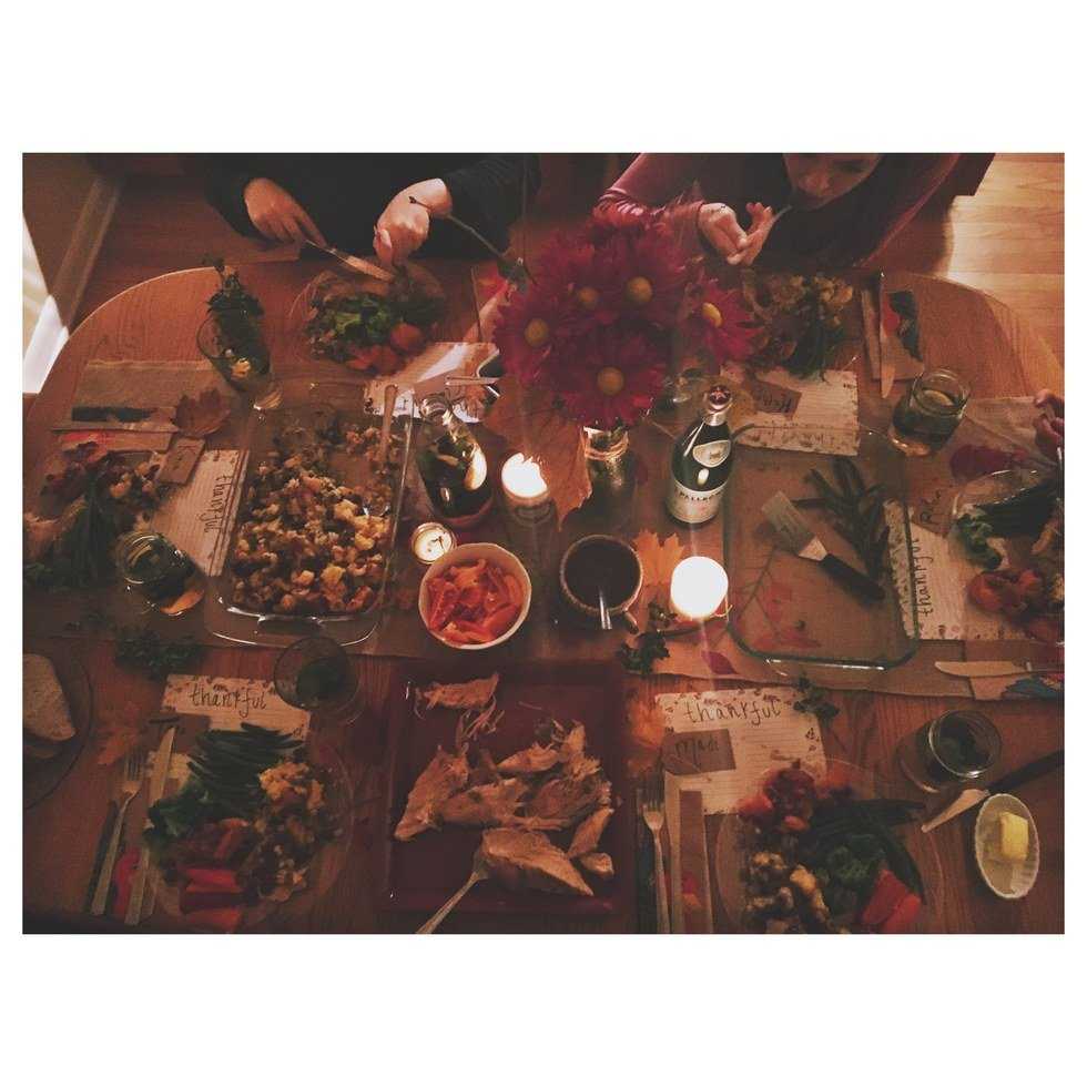 Last night, five of my dear friends and I gathered together around our kitchen table for a trendy "friendsgiving" meal. I had way too much fun decorating the table with foliage and flowers and cute napkins. My roommate Rachel made the most incredible turkey and stuffing, Tess made a pumpkin pie and we all sat together in the candlelight at the kitchen table, sipping on our blackberry ginger beer and stuffing our faces. Here, we shared the things we were thankful for and our most recent lessons from the Lord in this season of life.