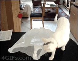 I remember my cat went to go check out a grocery bag my mom just brought home. Seconds later he was running frantically throughout the house because he got it stuck on his tail. Cats will explore everything but often won't like the end results.