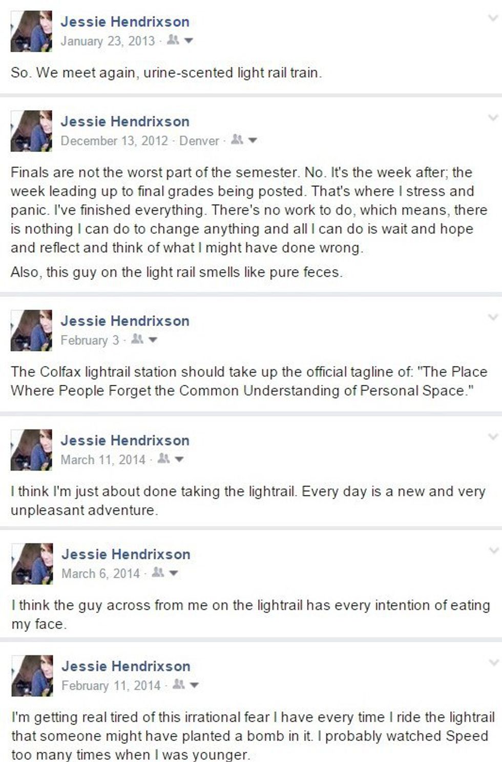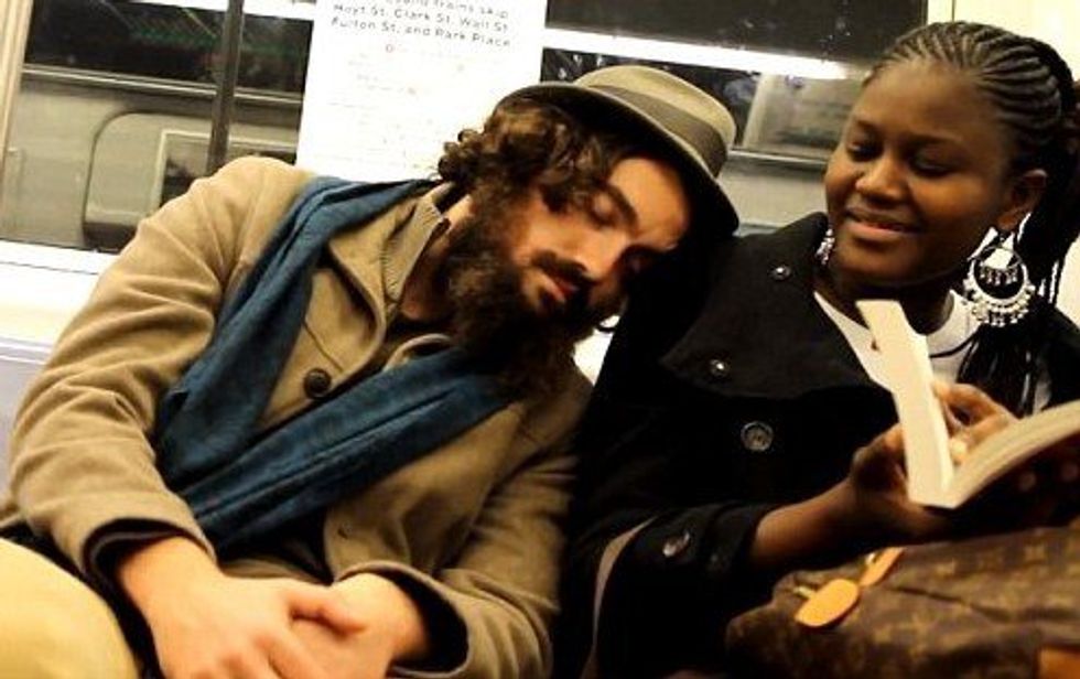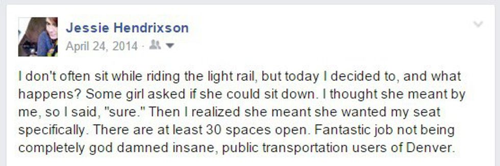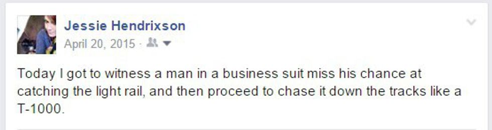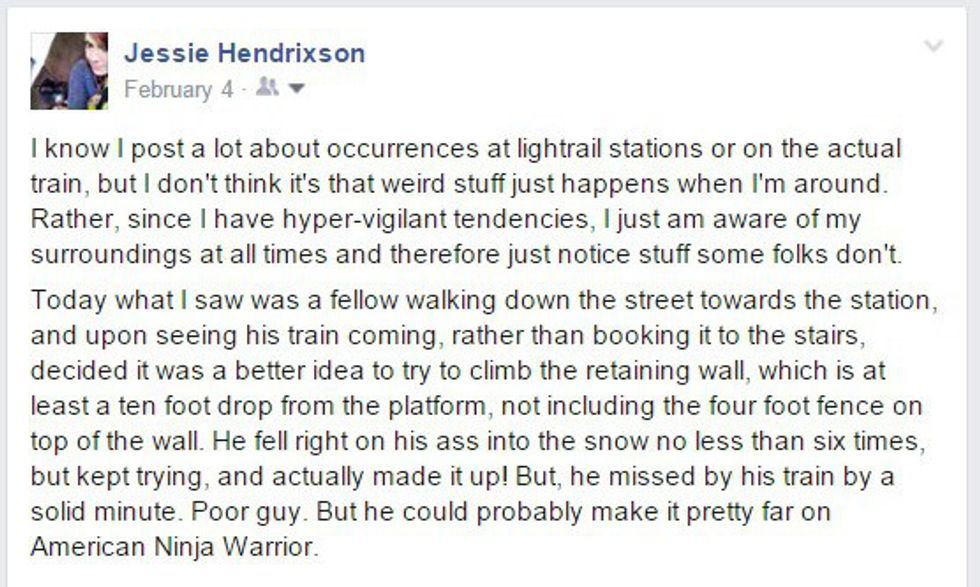 I am what my doctor describes as "hyper-vigilant." Basically, I like (or am forced to by the inner-workings of my silly brain) to be completely aware of my surroundings at all times to avoid any unexpected dangers. It may seem cool when I describe it to others, but it wreaks havoc on my poor little heart. But a result of this hyper-vigilance is my awareness of the people and things that go on around me when I'm on the train. Even with my sunglasses on (for preventing eye-contact with strangers) and headphones in (see note above about avoiding conversation), I still witness a lot. And what do we all do when we see something crazy happening in the real world? We post about it on Facebook, of course! And I post A LOT about these experiences: