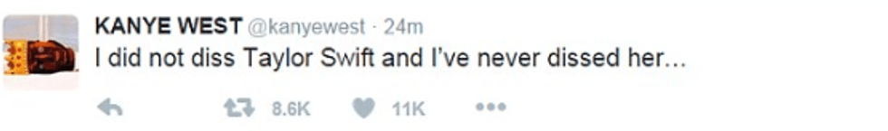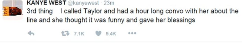 One of the songs from TLOP titled "Famous", featuring Rihanna and Swizz Beats, Kanye says "I feel like me and Taylor might still have sex. Why? I made that b*tch famous." I am no Taylor Swift fan at all, but these lyrics caused a huge storm, especially from the Swift fandom (obviously). But, according to Kanye, he got permission from Taylor to use these lyrics in his song and, of course, resorted to Twitter to let everyone know that.