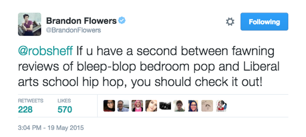 For some reason, last year Sheffield was the one to review The Killers’ frontman Brandon Flowers’s second solo album The Desired Effect. He did give it a decent 3.5/5 stars, but he still managed to make some insulting jabs at Flowers. This time, though, it was 2015 and Flowers has a Twitter.