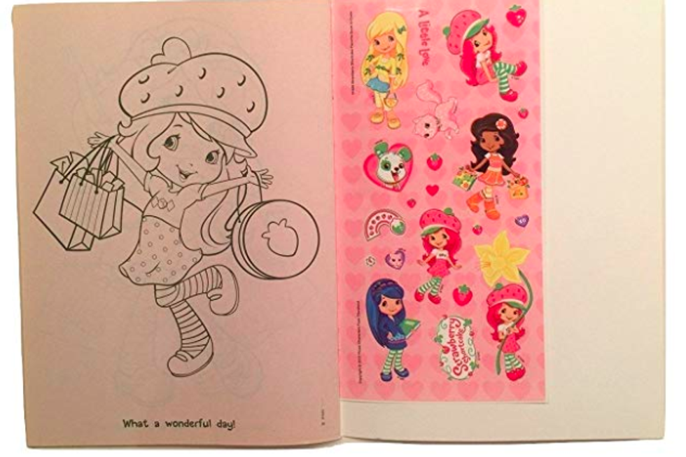 I admit, I've always had a thing for stickers. I love them, but in moderation. Well, sometimes. When I was younger, I had countless coloring books and sticker books. One memorable coloring book was a full-size, giant color book of Strawberry Shortcake and friends. It came with scented stickers, so you can imagine how that was. I've included a picture for your imagination of 7 year old me sprawled on our apartment's living room carpet, Crayola markers and pencils scattered around me and this giant book.