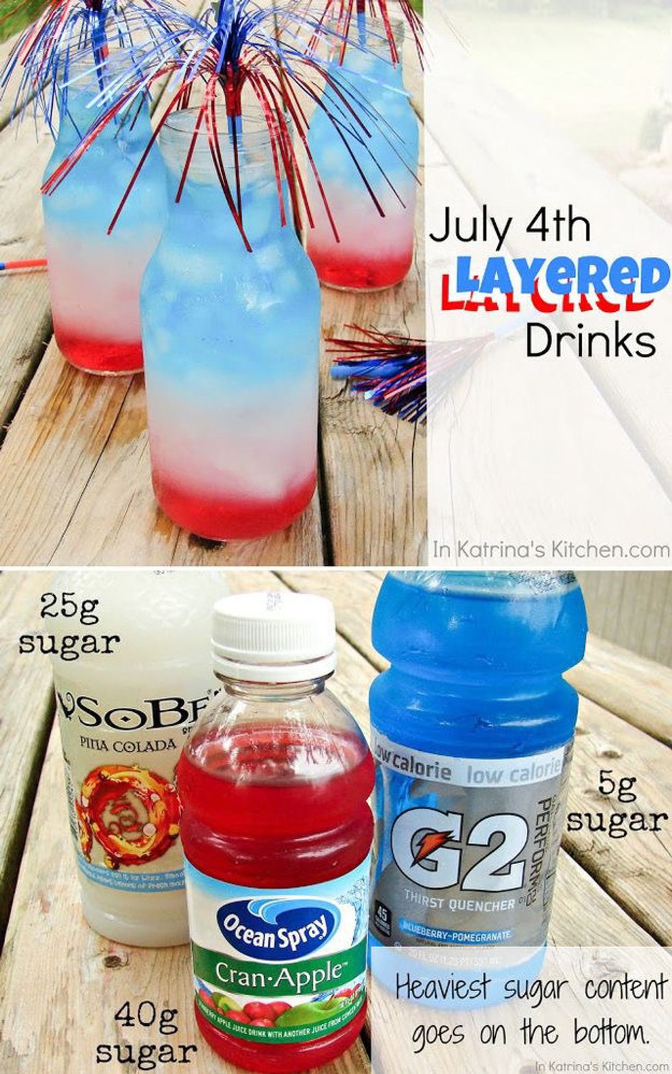 This is such an cute drink to try for kids who want to be as festive as the grown ups. Place the drink with the highest sugar content on the bottom, the second lowest above, and the one with the lowest sugar content on top. To keep the colors separated, you can pour the first color, and then add ice. This process can be continued for the rest of the layers as well. Personally, when I layer drinks I don't use this method, I put the first layer, then using a spoon I pour the second layer. I have yet to figure out the science behind how it doesn't blend together, but that's my go to way of layering drinks if you don't want to add any ice. If the adults love this adorable drink for the kids here's the alcoholic version they can try.