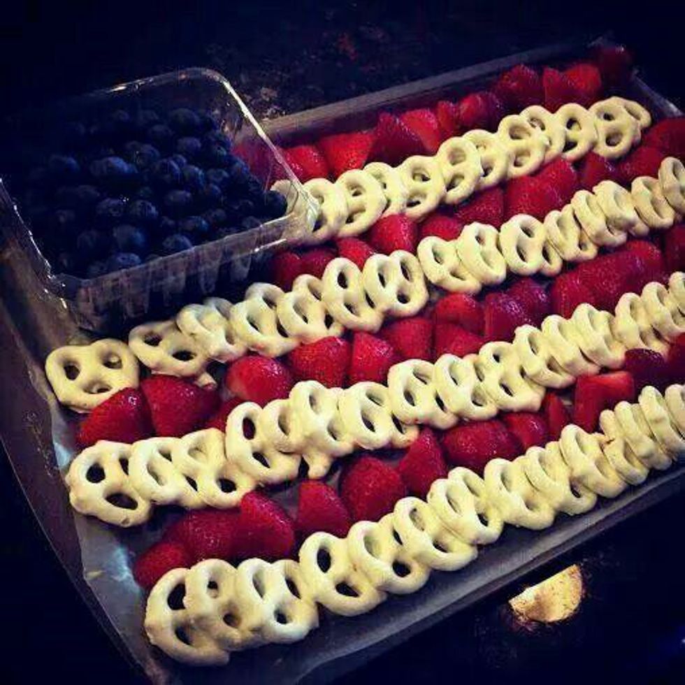 This is an awesome treat I'm looking to try this holiday it's the best way to enjoy some snacks without cheating on your diet. Unfortunately I'm allergic to blue food coloring and blueberries so my treat will be just white and red but it'll be healthy none the less. Get some white chocolate chips and melt them then dip your pretzels, regular or pretzel sticks and put the, on wax paper and set to dry when they're done place them on the pan then place some strawberries in between them. If you're looking to save this holiday a little frugal tip is to do a row of strawberries and a row of cherries or cut the strawberries in half and place them on the tray. If you're like me and can't eat blueberries or anything colored blue, this is where your fruit flag stops. If not, you can be precise and line up a couple of blueberries or just put a whole cup of it. If you're trying to be healthier, swap out the chocolate pretzels for bananas.