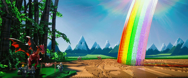 For example, two of my favorite jokes in the film happen toward the beginning of the third act. The first one happens after all of the Master Builders and our hero Emmet (Chris Pratt) are captured by the evil corporate villain Lord Business (Will Ferrell). Lord Business locks the heroes up and turns the top of his hilariously high business tower into an imposing black monolith of a ship to take over all of the Lego worlds. As the ship begins to separate from the building Lego pieces of debris are falling, the room is shaking, the captured heroes are yelling in terror, and the music is so dramatic that it feels like this is an important point of drama for the characters. However, when it cuts to a long shot of the ship blasting off from the building, the music cuts of and the outside building is made of smaller Legos. We see the tower piece separate as it is pulled off by a little string and floats away while you here someone in the background making hilariously bad plane noises with their lips. It's also twice as funny when you realize that the background sky is crude construction paper.