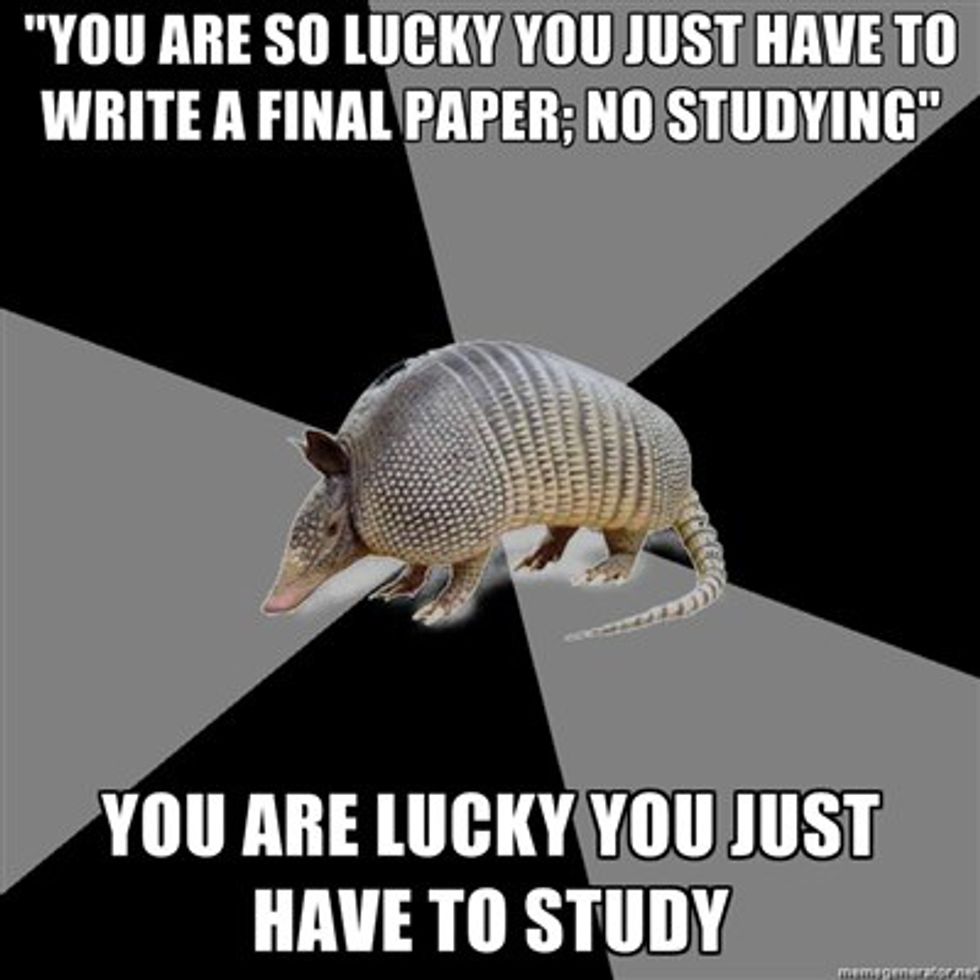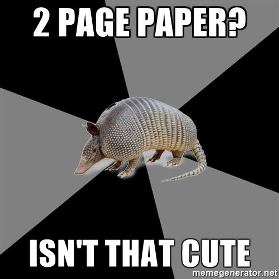 Also, we will scoff at you if you get stressed over a measly two-page paper. We may understand in our minds that writing isn't your forte, but it is hard to accept this in our hearts. We break our backs on long essays in short periods of time, so yes, we will pass a little bit of judgement on your stress over two pages. We don't mean it in a condescending light, but sometimes we can't help ourselves. (And you can't say that you've never slightly judged one of us for not getting a math concept right away.)