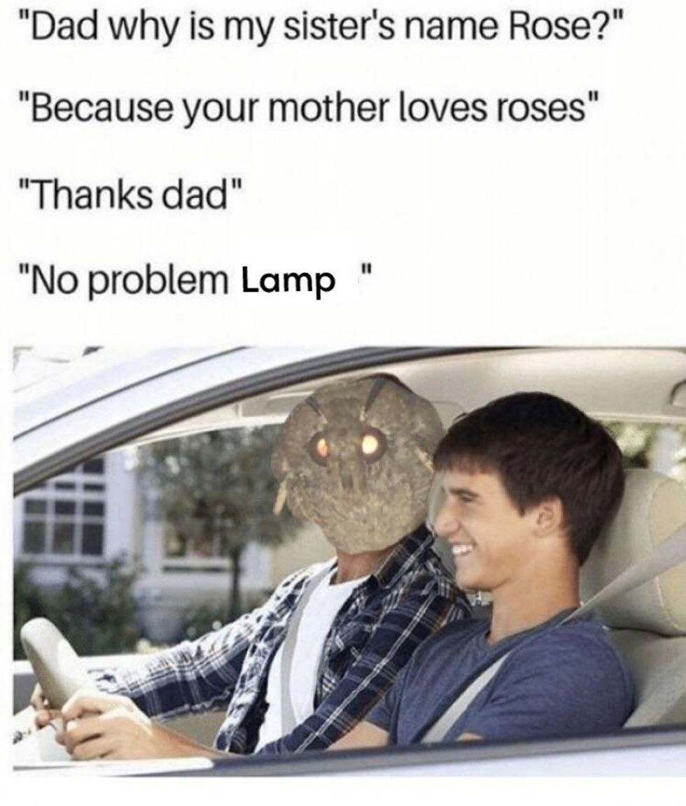 Yet another entry in the moth theme this week is this meme. It takes the classic meme form of a son asking his father about his sister's name, but the addition of the moth refreshes this stale format