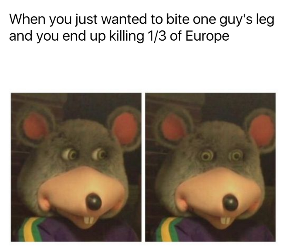 The look of sudden and horrifying realization that Chuck E. expresses in this image makes this meme one of my current favorites. It should represent a fairly normal kid's restaurant mascot, but many of us can relate to this facial expression which is why this is one potent meme. Maybe even as potent as that little plague that went through Europe a little while ago...