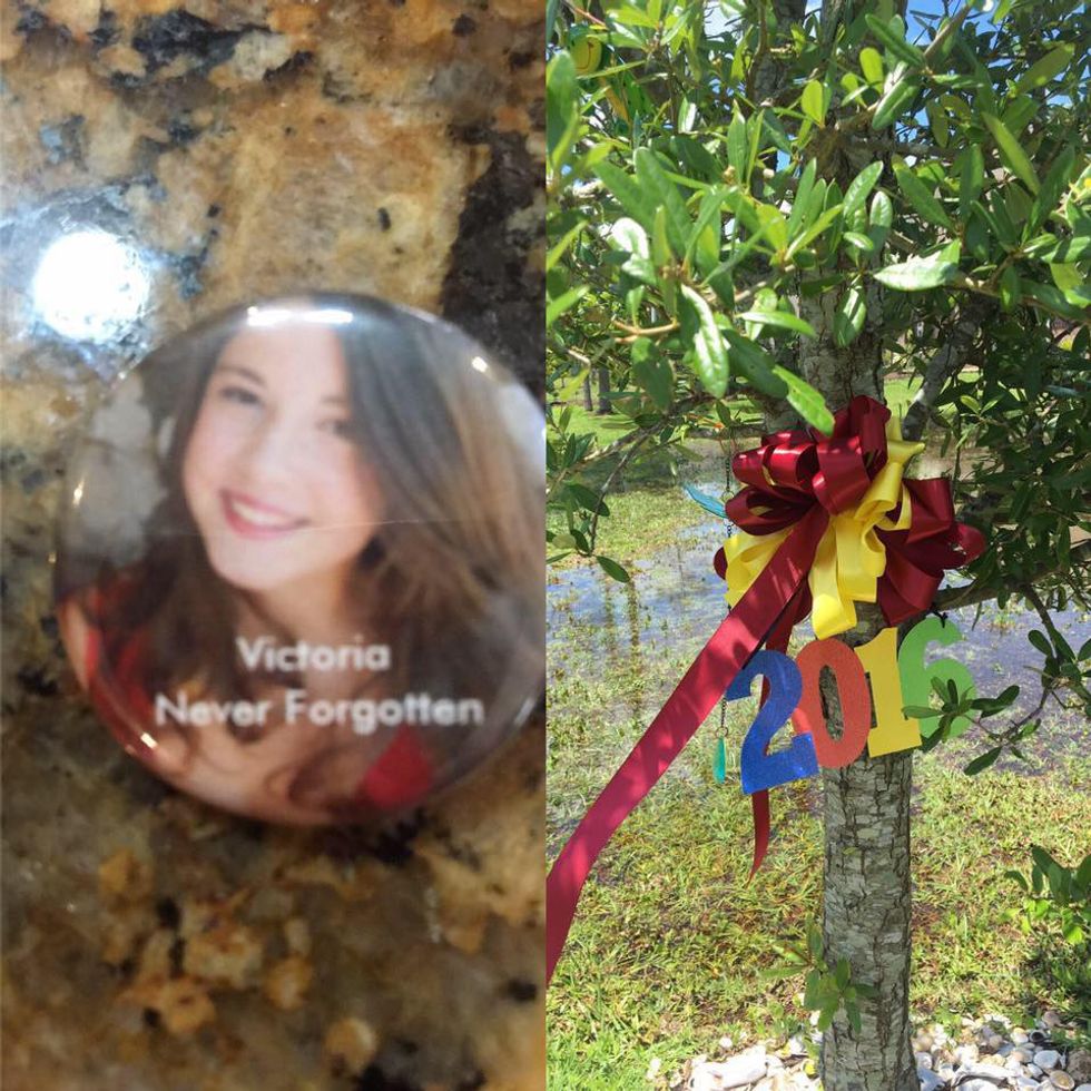 A year and a half passed, and it was time for graduation. During graduation rehearsal, pins were passed out with a picture of Victoria on the pin. There was also a small (but big) quote on the pin: "Victoria; Never Forgotten." It was extremely touching to see that someone went out of their way to make these so that it can be seen that Victoria was with every single one of us as we walked across that stage. We then paid tribute to Victoria in a moment of silence during graduation later that evening.
