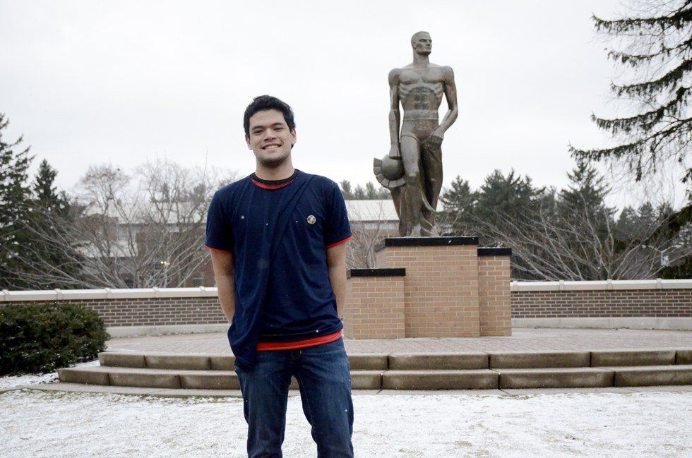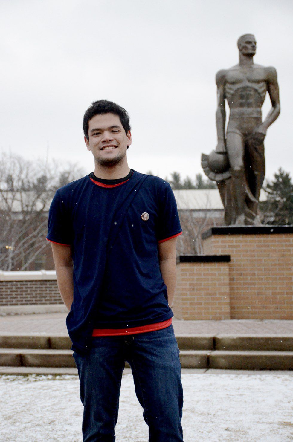 Photo by Moriah Dufrin; Me in front of Spartan Statue wearing Victoria's Pin