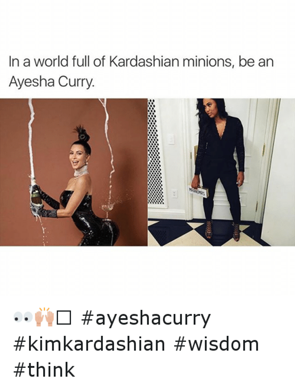 This image and others like it inherently imply that women who do not embody the stereotypical domesticated wife are to be condemned. Let me fill in the gaps here. When her husband was sent into the stratosphere for being one of the best players in the NBA, and her daughter for being one of the most photogenic toddlers ever, Ayesha Curry was immediately dubbed #queen and #goals for all of social media. Let me make it clear: I don't object to her new status as a role model. Hey, if that's the kind of wife you want to be, then, by all means, look up to Mrs. Curry. But why does your admiration of Ayesha have to come with a condemnation of Kim Kardashian? News flash: Kim settled down with the one and only Kanye West and had two equally adorable children by him, which makes her a wife, too. Just because Kim opted out of being as low-profile as Ayesha doesn't make her rightful ammunition for your meme cannon.