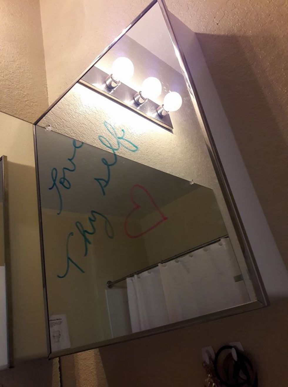 But, until those words are truths, the mirror knows how you really feel. You cannot hide from the horrific thoughts of self-hatred because they lurk in the drain.