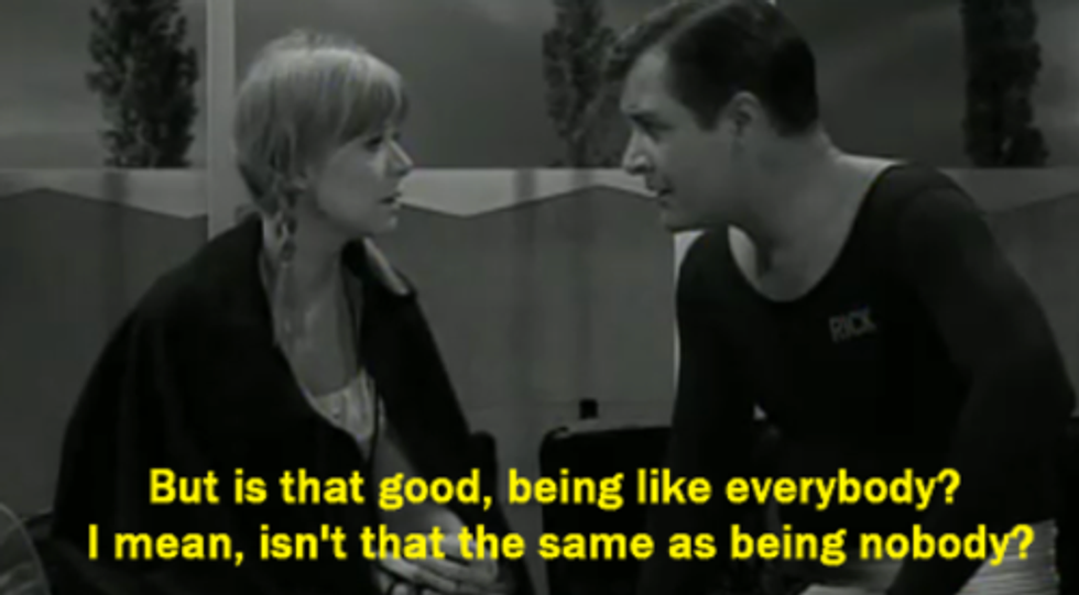 For whatever reason, that statement gave me a panic attack. It was like my teacher was saying everyone was the same in terms of culture and thought. But instead of thinking equality, my mind went straight to that Twilight Zone episode “Number Twelve Looks Just Like You." That episode centered around a girl who desperately clung to her identity in a future where everyone in that world lost all sense of identity and became just like everyone else. Isn’t that your worst nightmare?