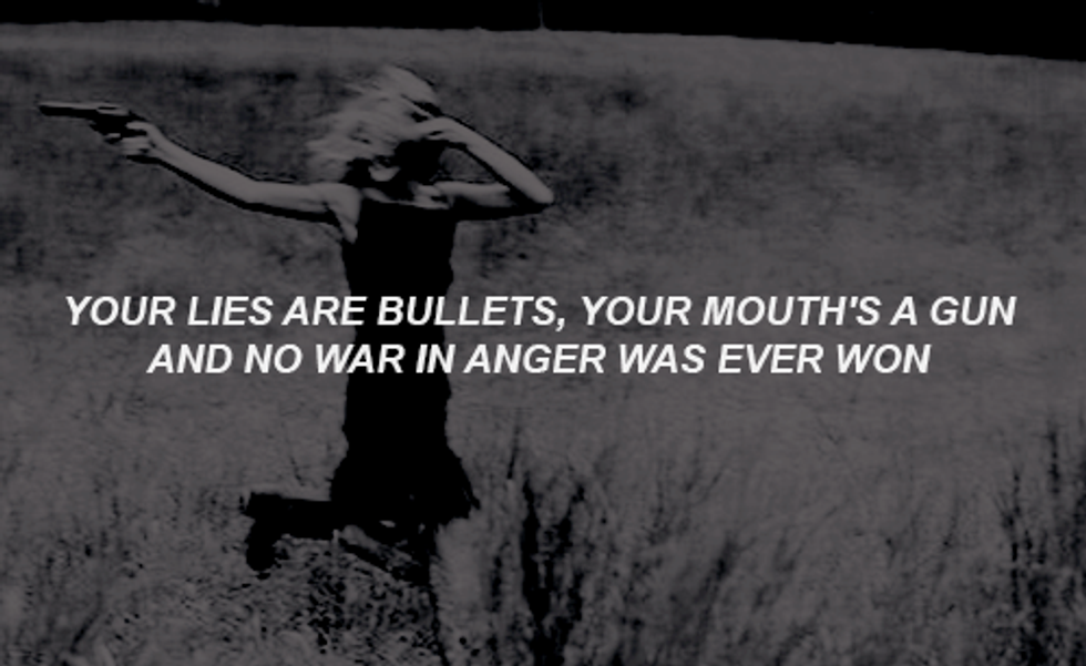 "Your lies are bullets. Your mouth's a gun. And no war in anger was ever won. Put out the fire before igniting. Next time you're fighting kill 'em with kindness."