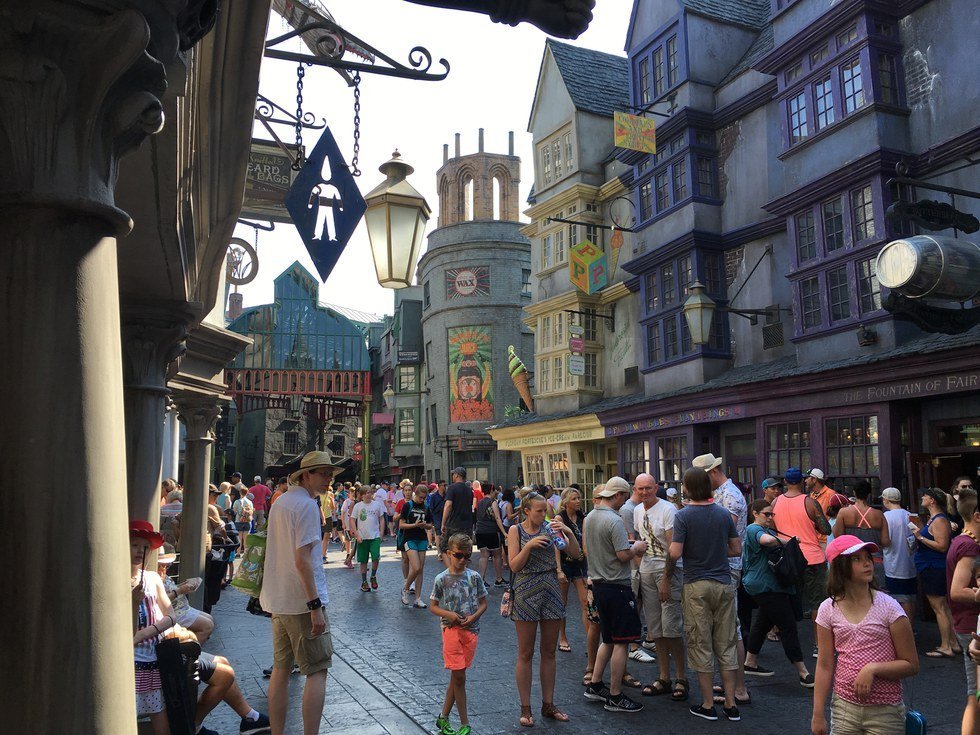 There was a whole other park to see, so we hopped on The Hogwarts Express and ventured off. After the train ride, I maneuvered around the crowd until I came to brick wall. I moved around it and there I was, in the flesh, standing right in the middle of Diagon Alley. A giant dragon was perched atop Gringotts Bank and spewed flames. Kids were running in and out of the candy shop that sold chocolate frogs and fizzing whizbees. I walked past window shops that sold Hermione’s Yule Ball dress and books by the infamous Gilderoy Lockhart. Heck, even a recording of Moaning Myrtle played in the bathrooms.